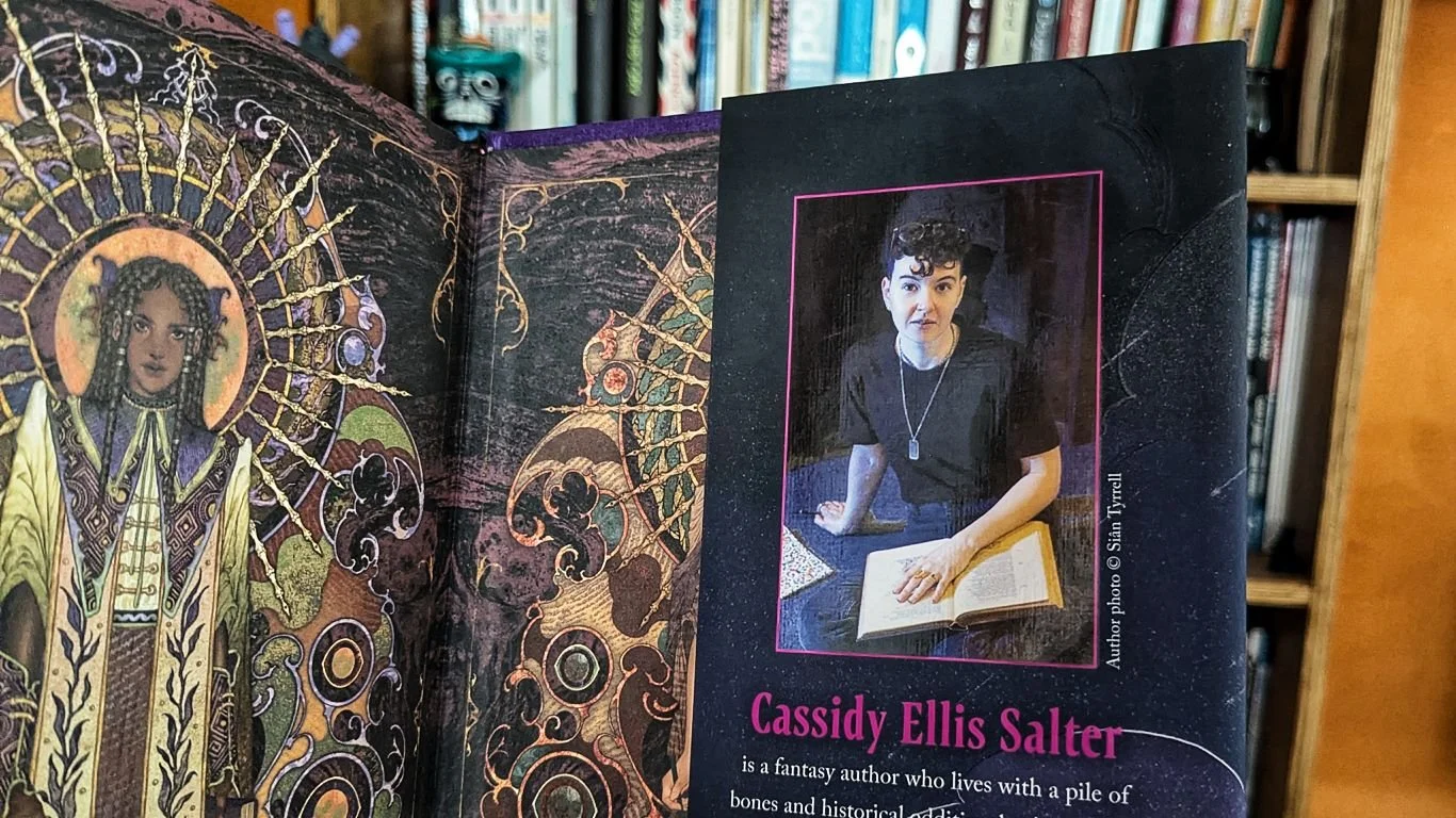 Inside flyleaf of These Shattered Spires showing author portrait by Snake, Star & Skull by Sian T. Photography